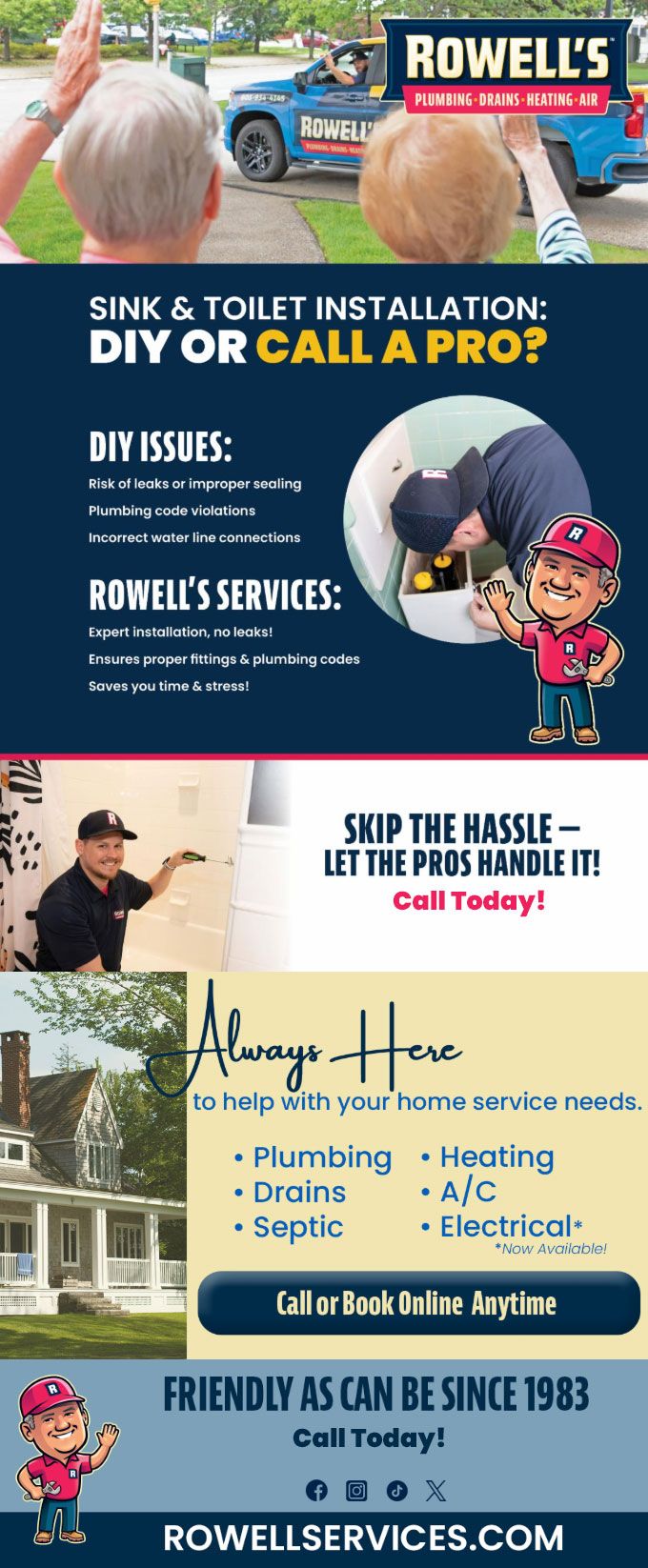 "Friendly As Can Be Since 1983!" When you need help with your plumbing, drains, heating, cooling or electrical in Tamworth, you can always rely on Rowell's Services! Call us now or book online!
